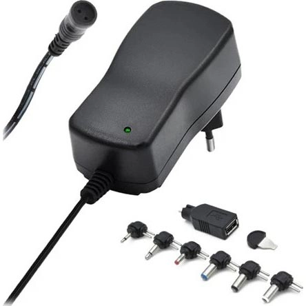 • Grâce à un sélecteur rotatif de la tension de sortie, il permet de régler facilement la valeur souhaitée entre 3 et 12 V DC, garantissant ainsi la compatibilité avec différents types d'appareils.
