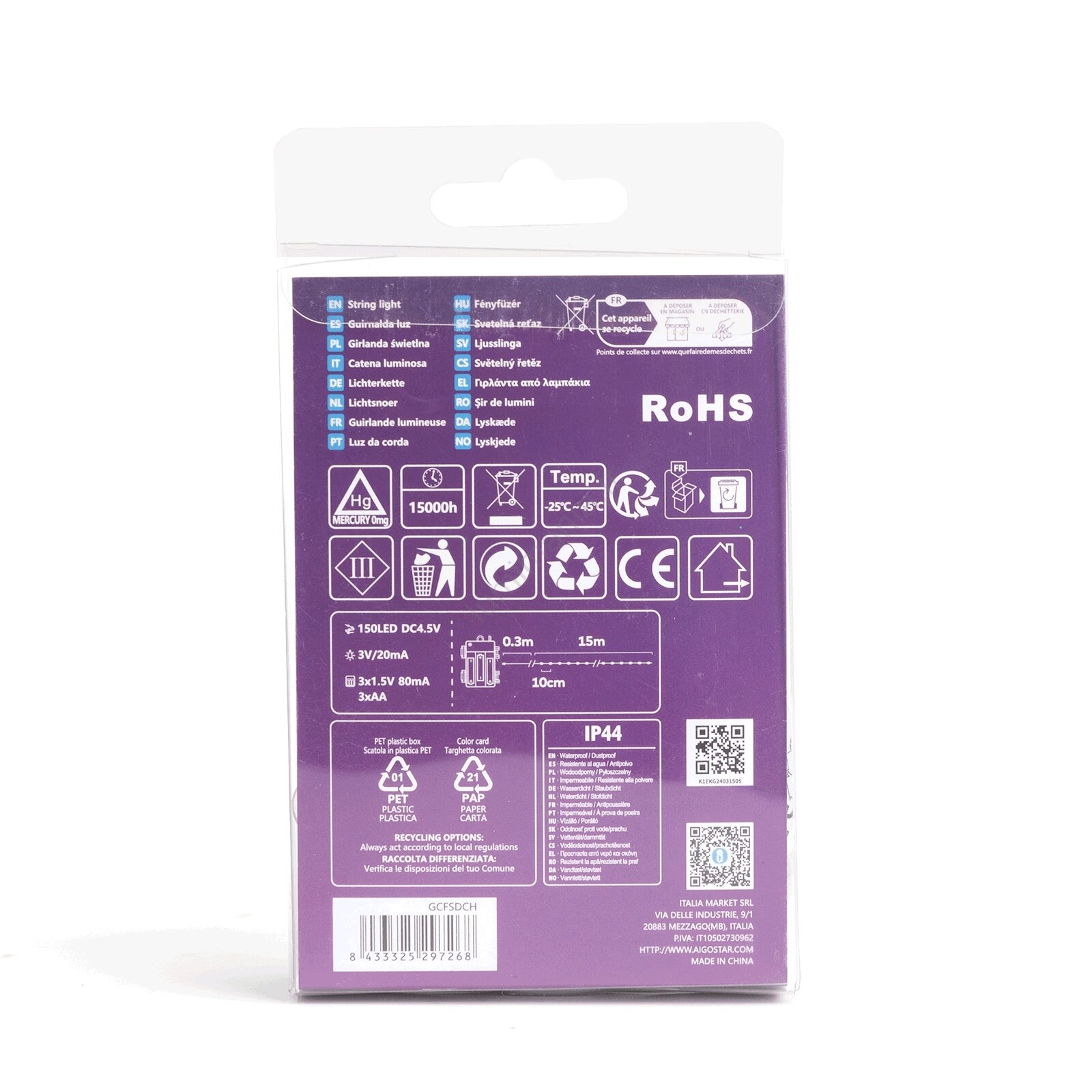 Aigostar - Guirlande LED extérieure 150xLED/8 fonctions/3xAA 15,3m IP44 blanc froid