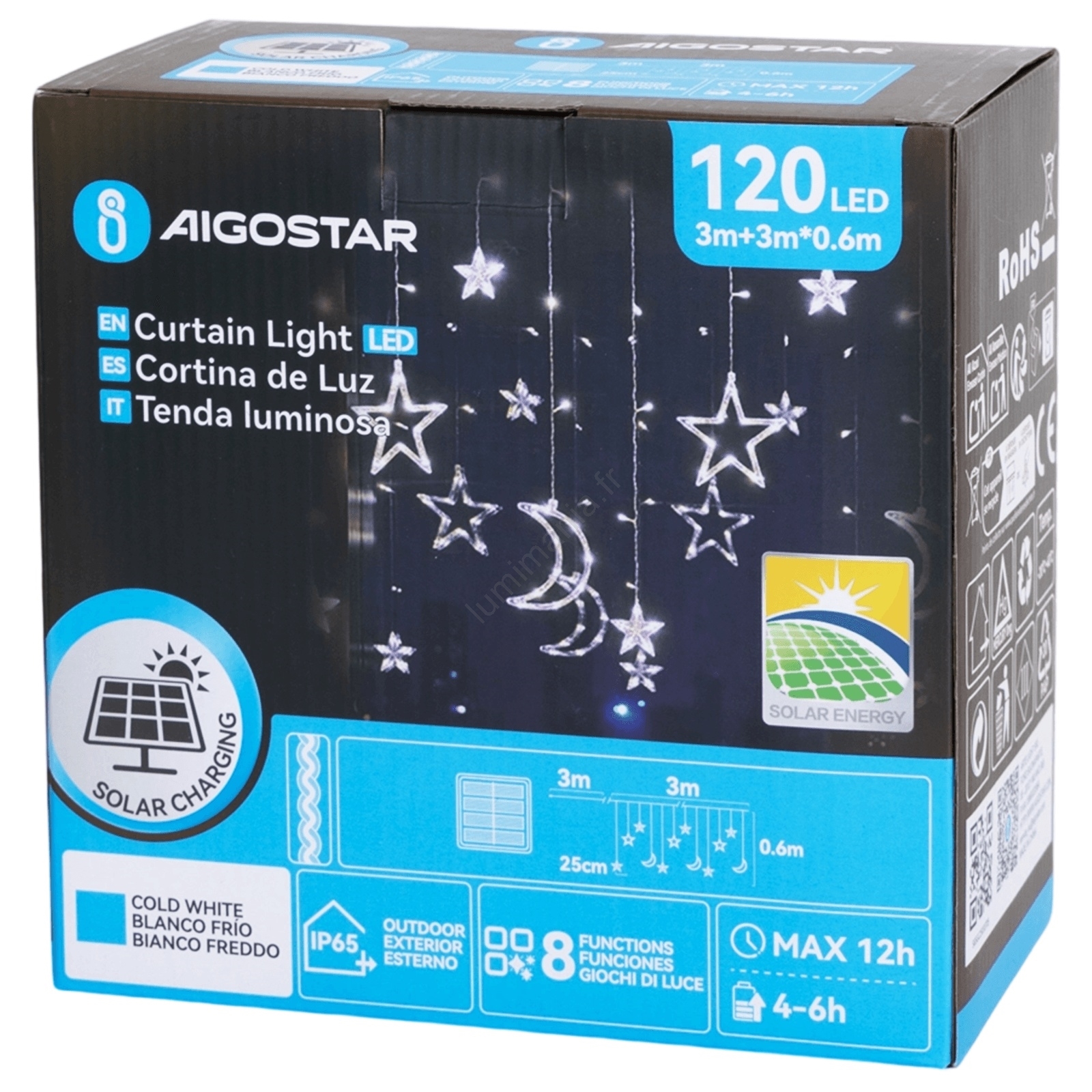 Aigostar - Guirlande de Noël solaire 120 LED / 8 modes, 3 x 0,6 m, 500 mAh, IP65, blanc froid