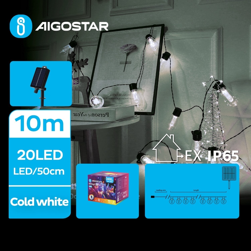 Aigostar - Guirlande solaire à LED 20xLED/8 fonctions, 11,5 m, 1200 mAh, IP65, blanc froid