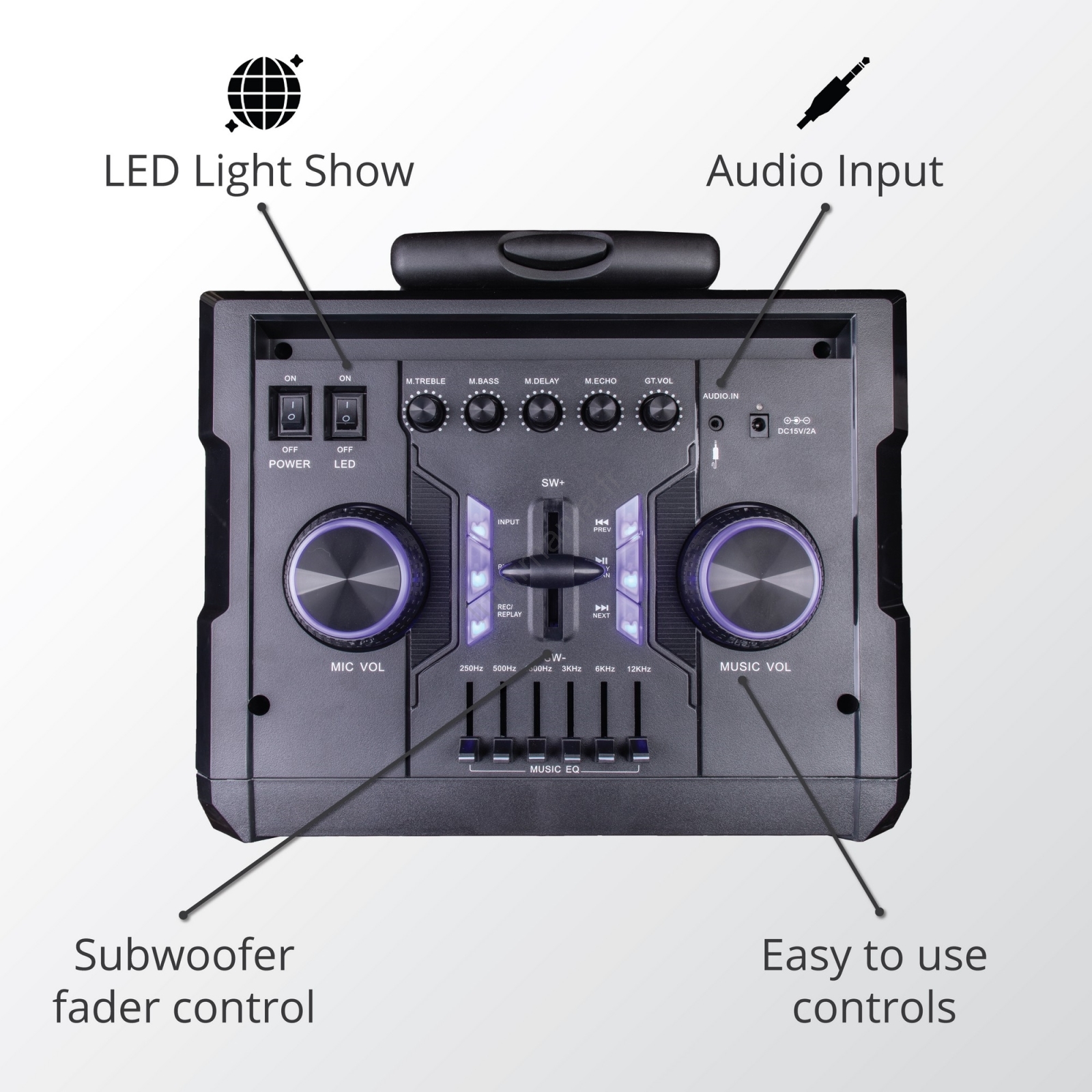• L'enceinte dispose d'un afficheur LED/VFD et d'effets lumineux LED.