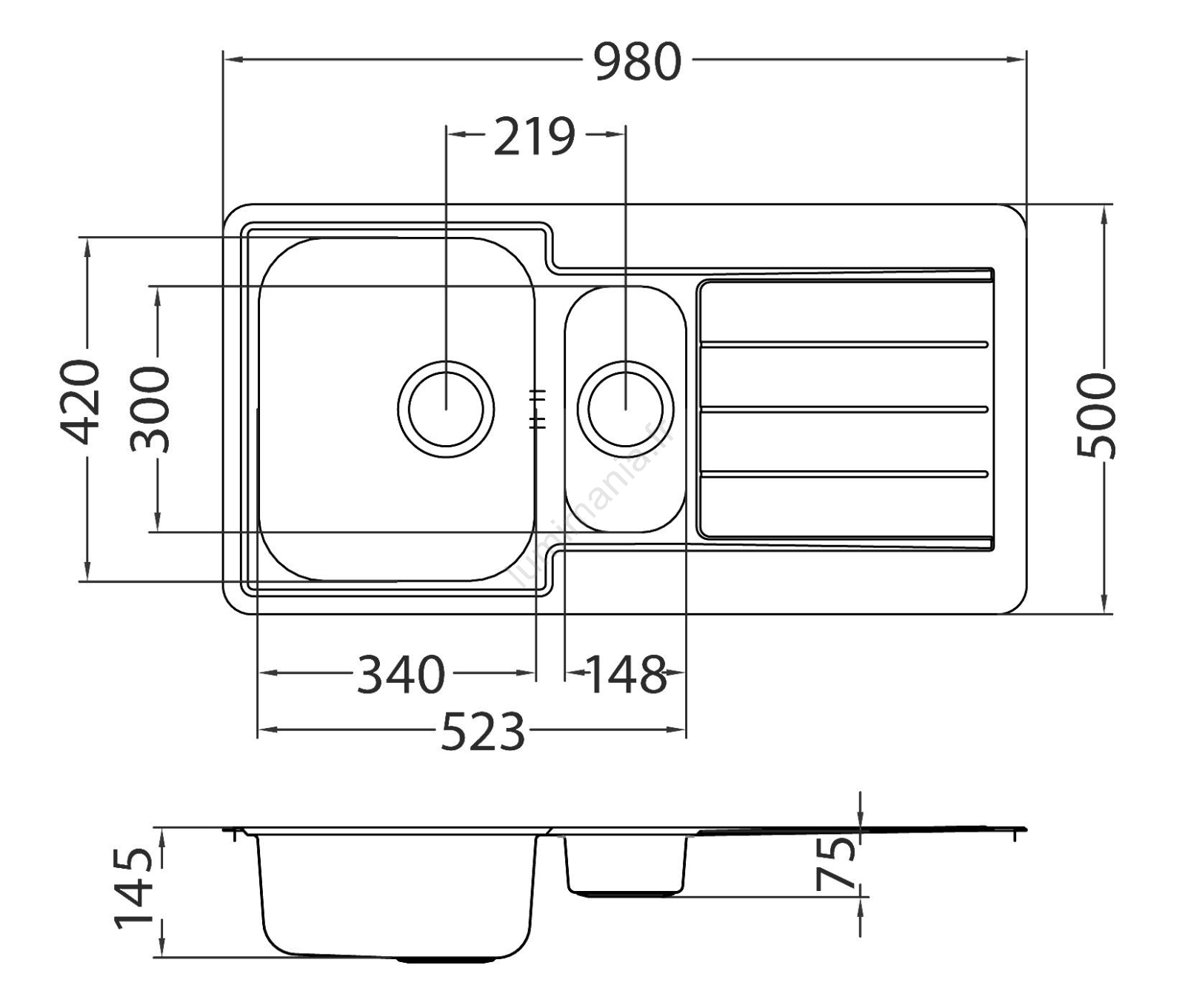 • Contenu de l'emballage: évier en acier inoxydable, fixations et joints, bonde panier 3 1/2, siphon avec prise pour lave-vaisselle.