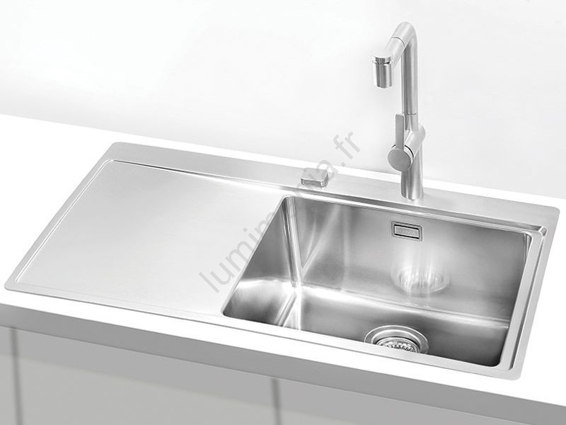 • Contenu de l'emballage : évier en acier inoxydable, fixations et joints, bonde panier 3 1/2, siphon avec dérivation pour lave-vaisselle, commande excentrique de vidange.