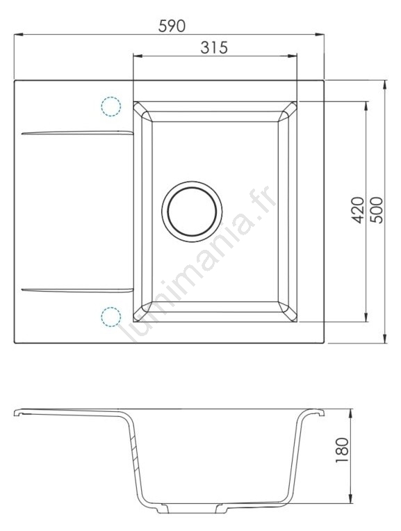 • Contenu de l'emballage : évier en granit, bonde panier 3 1/2, siphon avec dérivation pour lave-vaisselle, mitigeur d'évier, flexibles de raccordement, kit de montage.