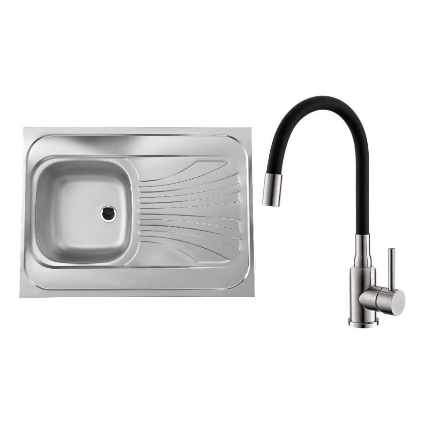 ALVEUS SETA24019 - Évier de cuisine CLASSIC 80 x 60 cm + mitigeur avec bec flexible MINTAS 34 cm, acier brossé/noir