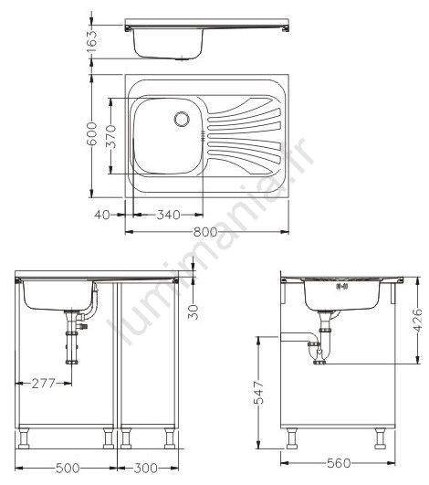 • Obsah balení: évier en acier inoxydable, bonde 1 1/2, siphon avec dérivation pour lave-vaisselle, bouchon, mitigeur, flexibles de raccordement, kit de montage.