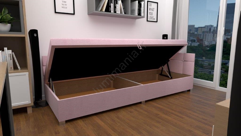 • Lit coffre rembourré AMSTERDAM 90 x 200 cm avec tête réversible et grand espace de rangement, rose
