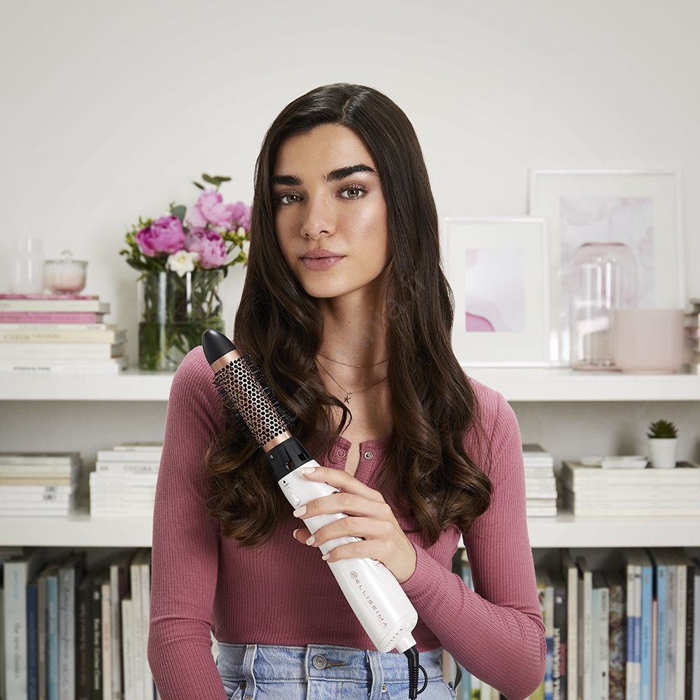• Le kit comprend 5 embouts : brosse ronde (32 mm), brosse ronde (50 mm), fer à boucler (19 mm), brosse rectangulaire et concentrateur de séchage.