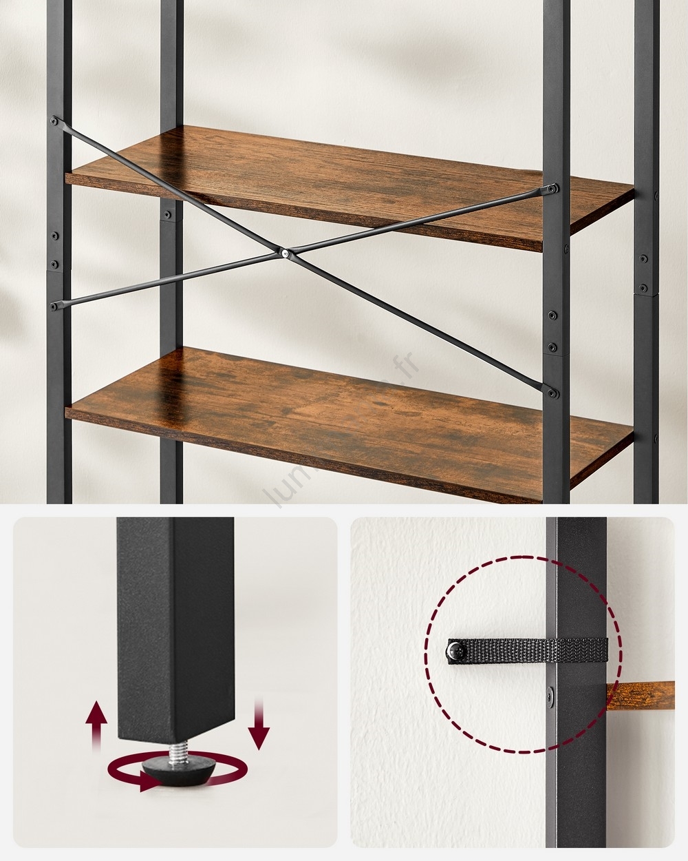 • Le kit anti-basculement fourni vous permet de fixer la bibliothèque, augmentant ainsi sa stabilité et la maintenant au mur.