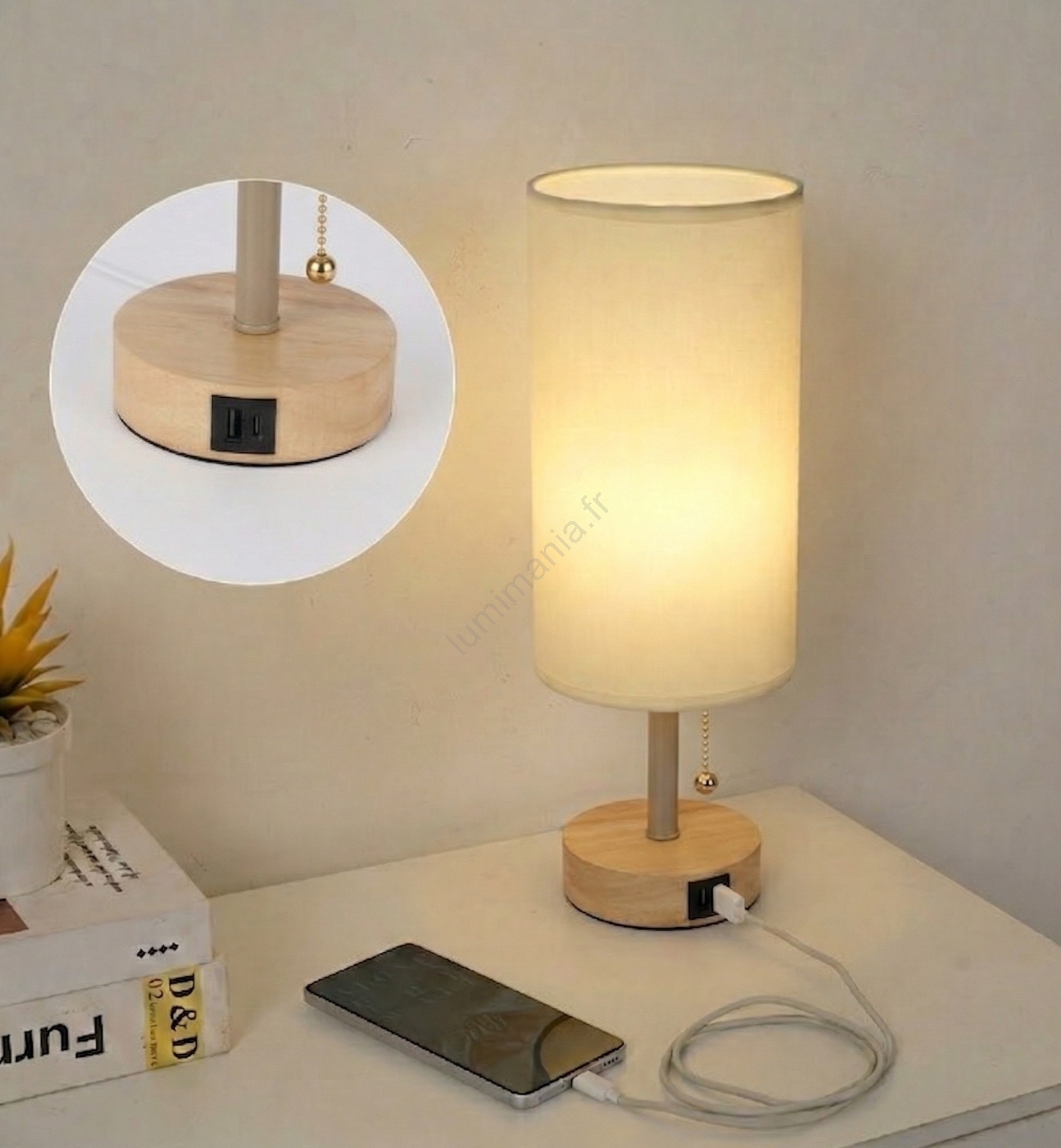 Brilagi - Lampe de table avec port USB TABLON 1xE27/25W/230V chêne/beige/crème caractérise un design agréable et fonctionnel.  Une ampoule à culot E27 convient pour ce luminaire. Ici, vous pouvez acheter d'autres ampoules à des prix avantageux. Vous aurez un ajout intéressant dans votre intérieur.
