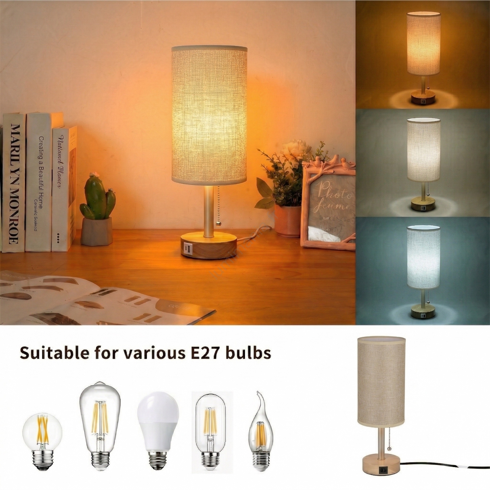 Brilagi - Lampe de table TABLON avec port USB 1xE27/25W/230V chêne/beige caractérise un design agréable et fonctionnel.  Une ampoule à culot E27 convient pour ce luminaire. Ici, vous pouvez acheter d'autres ampoules à des prix avantageux. Vous aurez un ajout intéressant dans votre intérieur.