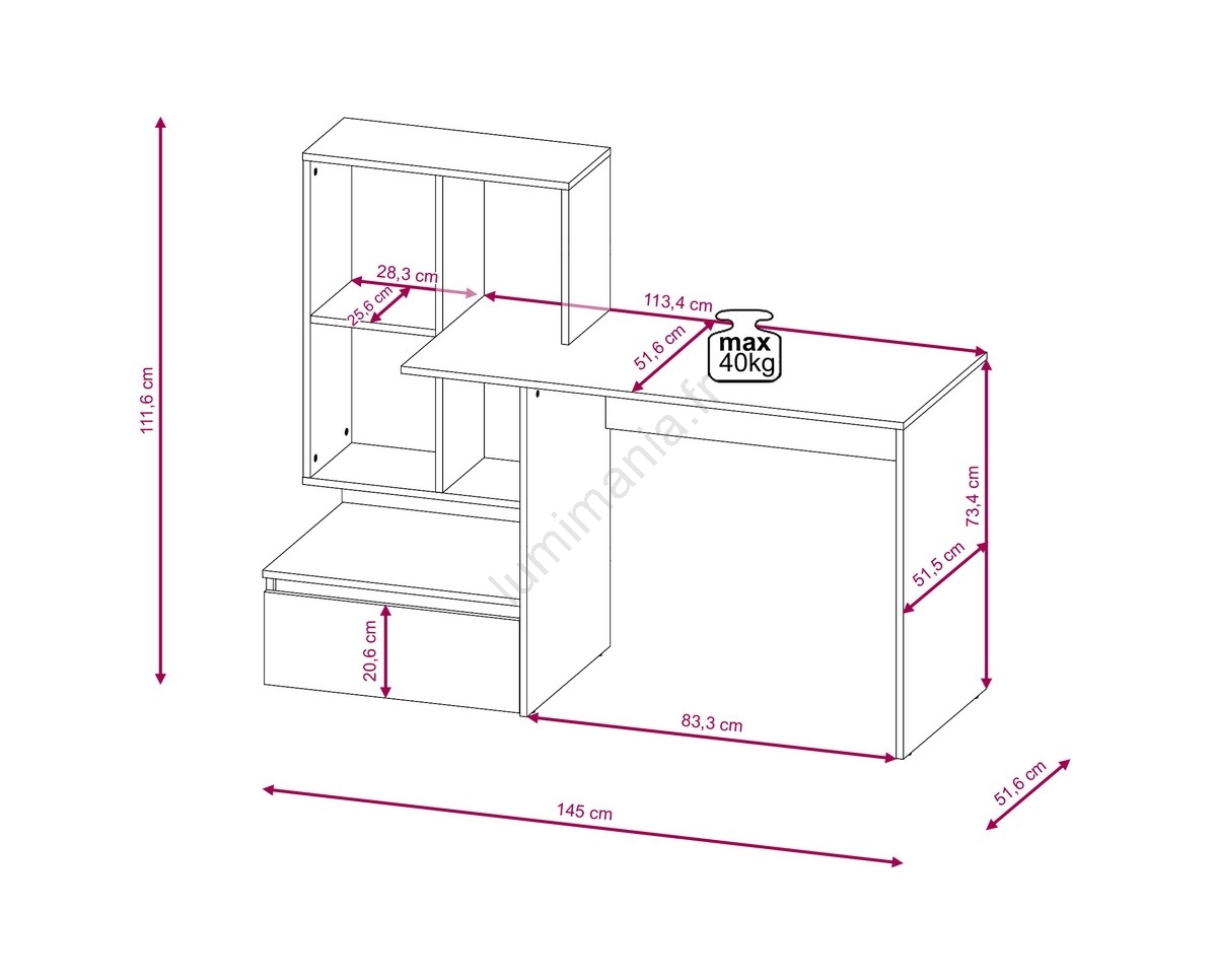 • La surface de travail rectangulaire est soutenue par une étagère latérale dotée de deux compartiments ouverts, idéale pour ranger des livres, des fournitures de bureau ou des objets décoratifs.