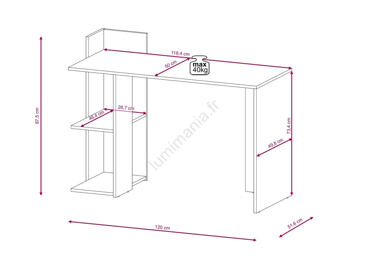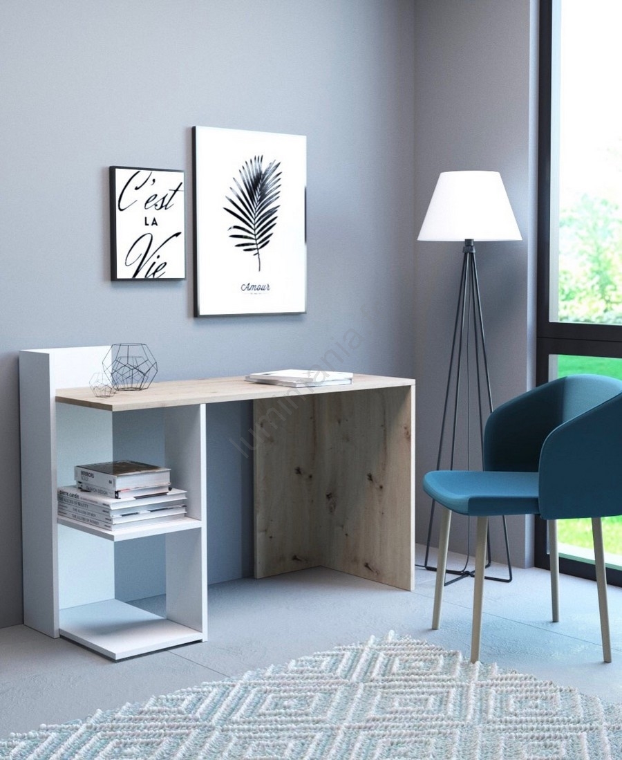 • Le plateau de travail rectangulaire repose sur une étagère latérale composée de deux tablettes ouvertes, idéales pour ranger des livres, des fournitures de bureau ou des éléments décoratifs.