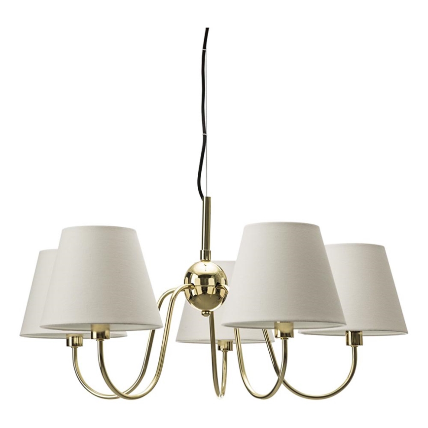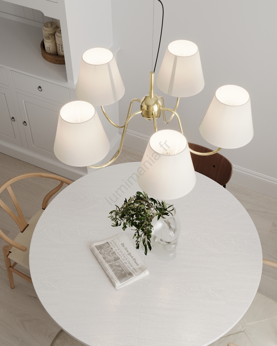 ByRydens - Suspension sur câble LYNF 5xE14/8W/230V laiton/blanc caractérise un design agréable et fonctionnel.  Une ampoule à culot E14 convient pour ce luminaire. Ici, vous pouvez acheter d'autres ampoules à des prix avantageux. Vous aurez un ajout intéressant dans votre intérieur.