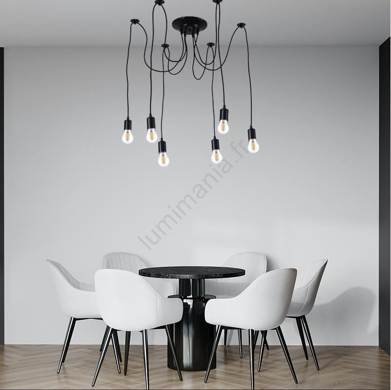 Câble d'alimentation 6xE27/60W/230V araignée noir caractérise un design agréable et fonctionnel.  Une ampoule à culot E27 convient pour ce luminaire. Ici, vous pouvez acheter d'autres ampoules à des prix avantageux. Vous aurez un ajout intéressant dans votre intérieur.