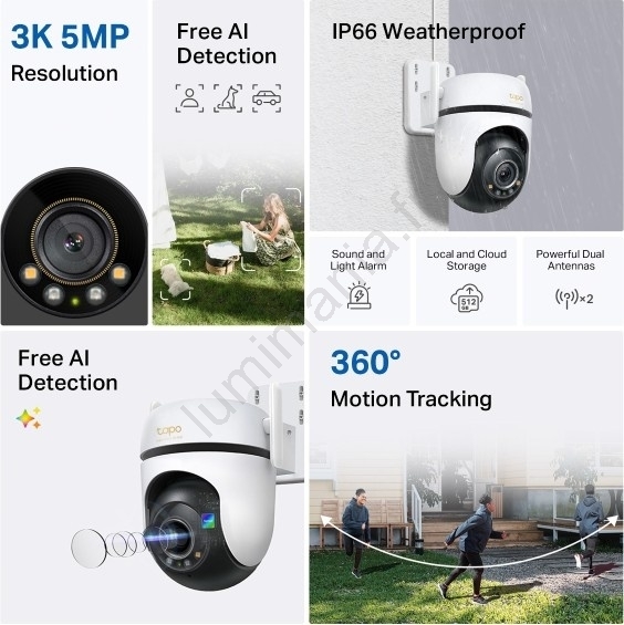 • Caméra de sécurité Wi-Fi extérieure avec tête motorisée orientable pour une large couverture et détection intelligente des personnes, des animaux et des véhicules.
