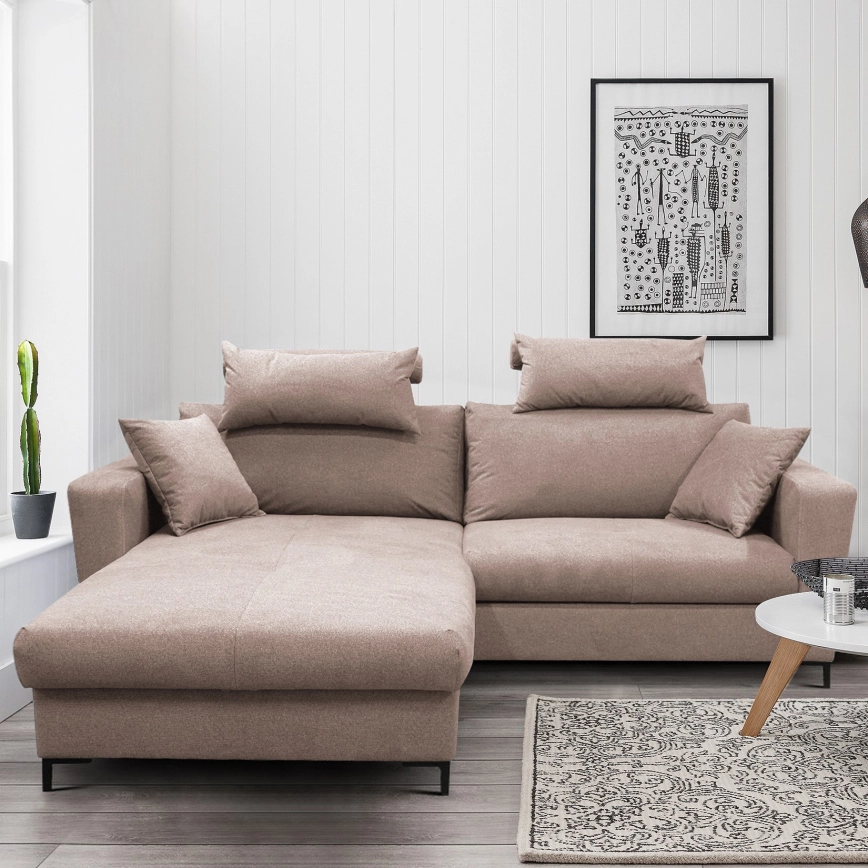 Canapé d'angle convertible en L HORTA, version gauche, rose, avec coffre de rangement