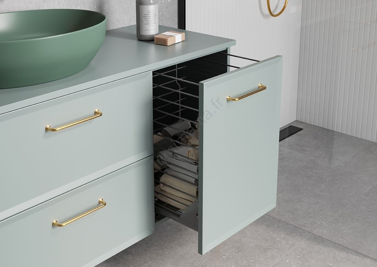 • Meuble de salle de bains mural avec panier à linge.
