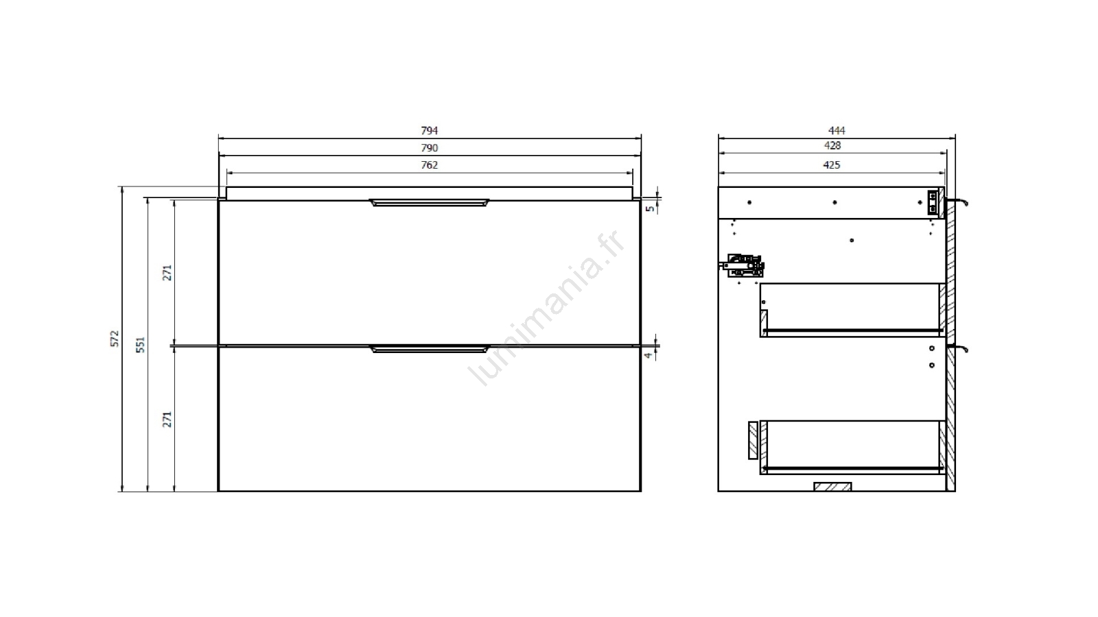 • La façade et le corps du meuble sont fabriqués en panneau de particules de 16 mm, laqués en blanc.