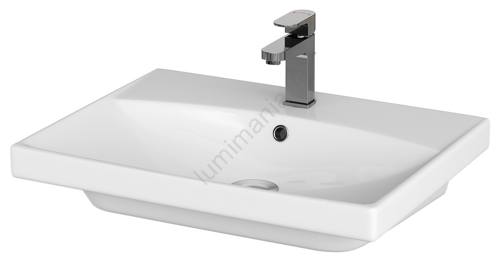 • Le lavabo en céramique présente une forme rectangulaire classique avec un trou pour robinet et un trop-plein.
