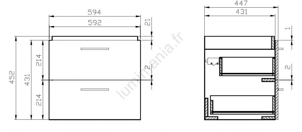 • L'armoire dispose de deux tiroirs spacieux avec fermeture amortie et poignées chromées.