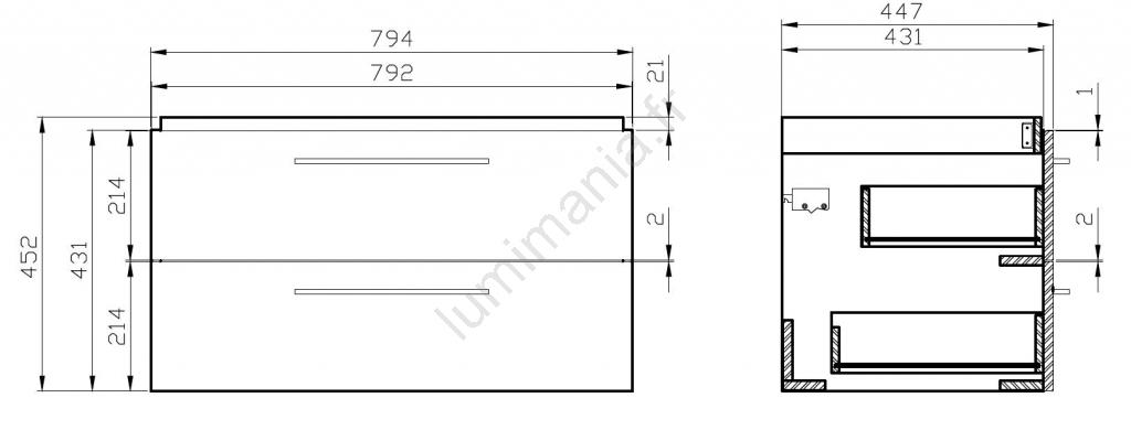 • L'armoire dispose de deux tiroirs spacieux avec fermeture amortie et poignées chromées.