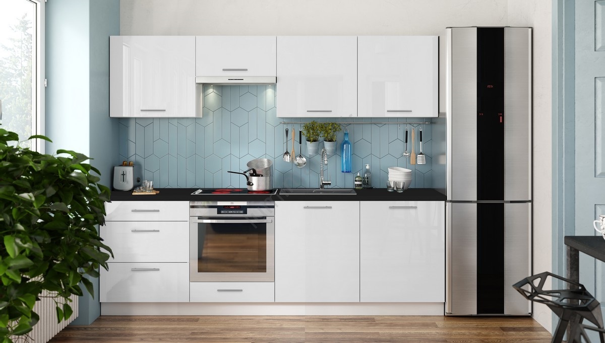 Ensemble de cuisine CELESTE 240 cm, blanc laqué brillant