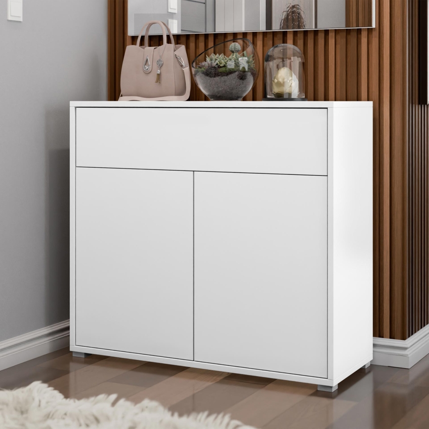 • La combinaison d'un tiroir spacieux et d'un meuble à deux portes avec étagères offre un espace de rangement idéal pour organiser clairement vos vêtements, documents et autres indispensables.