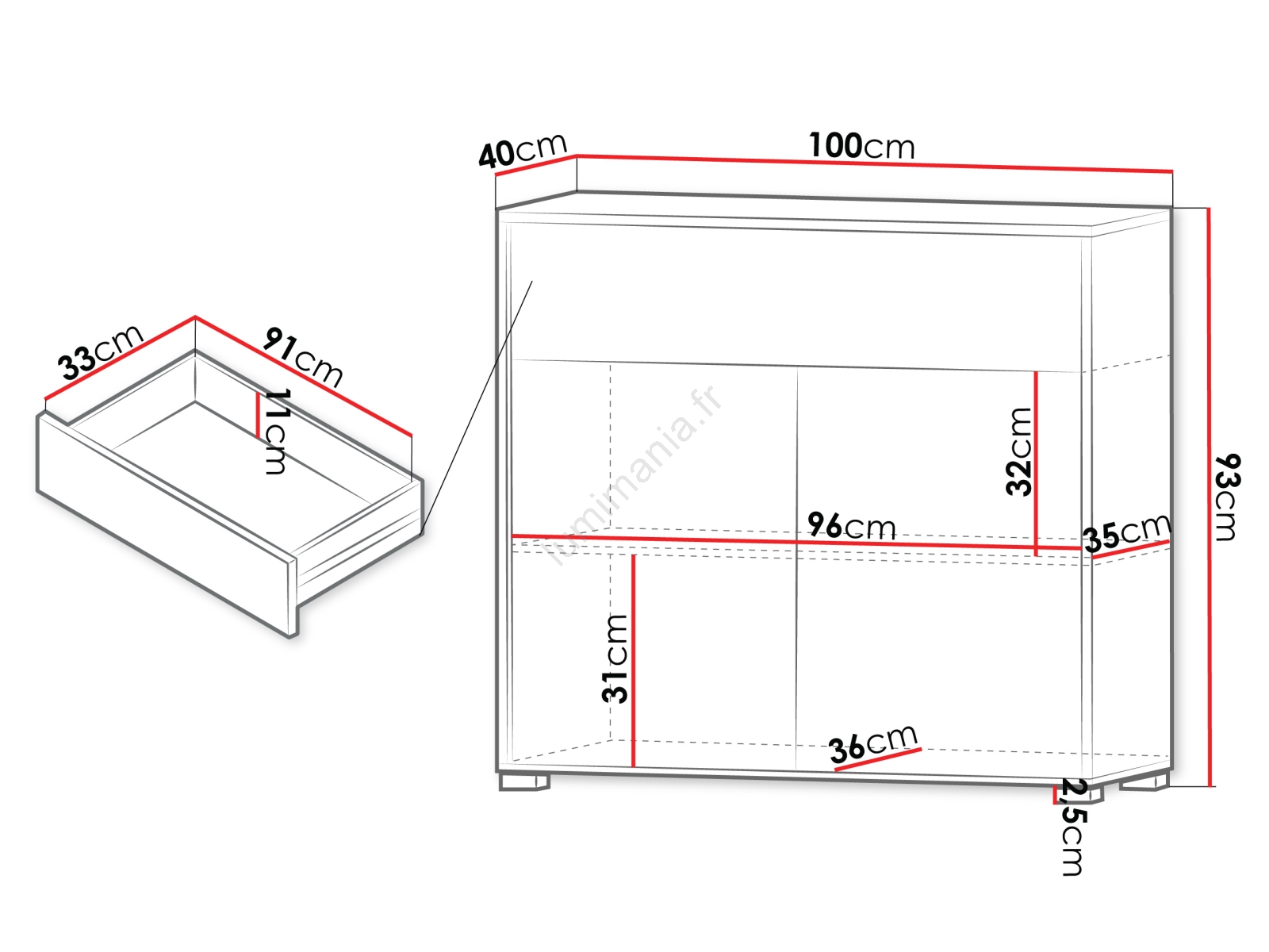 • La combinaison d'un tiroir spacieux et d'une armoire à deux portes avec étagères offre un espace de rangement idéal pour organiser clairement vos vêtements, documents et autres indispensables.