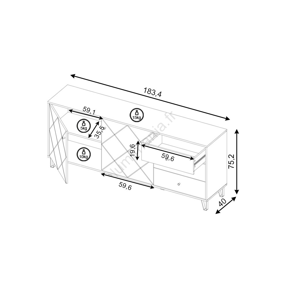 • Elle comporte deux portes sur la gauche et trois tiroirs sur la droite, offrant un rangement pratique et bien organisé.