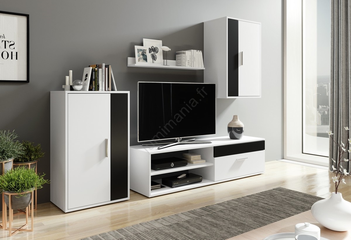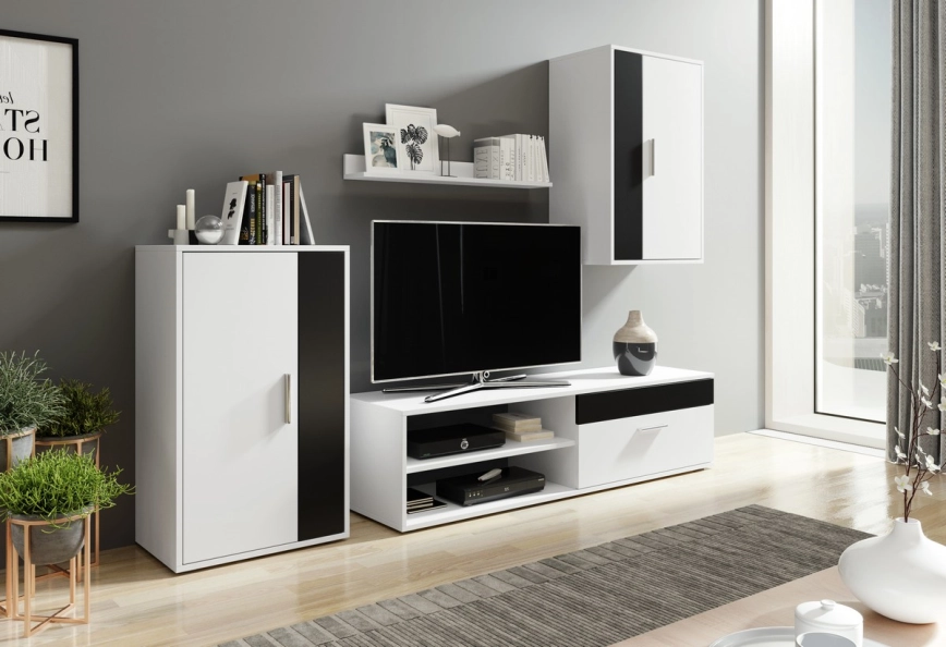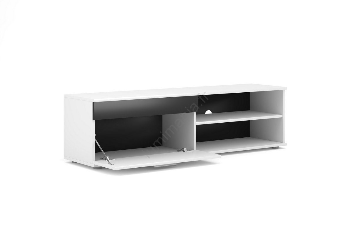 • Comprend un spacieux meuble TV avec des étagères ouvertes pour les appareils multimédia et des compartiments fermés pour un rangement discret.