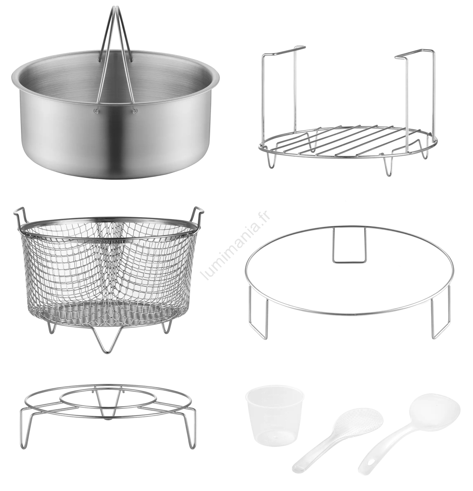• Accessoires : panier de friture 3,5 l, support pour couvercles, panier vapeur, support de cuisson vapeur, plaque/grille de grill, verre doseur (pour riz), cuillère plate en plastique, louche en plastique, récipient récupérateur de condensation pour l'eau excédentaire.