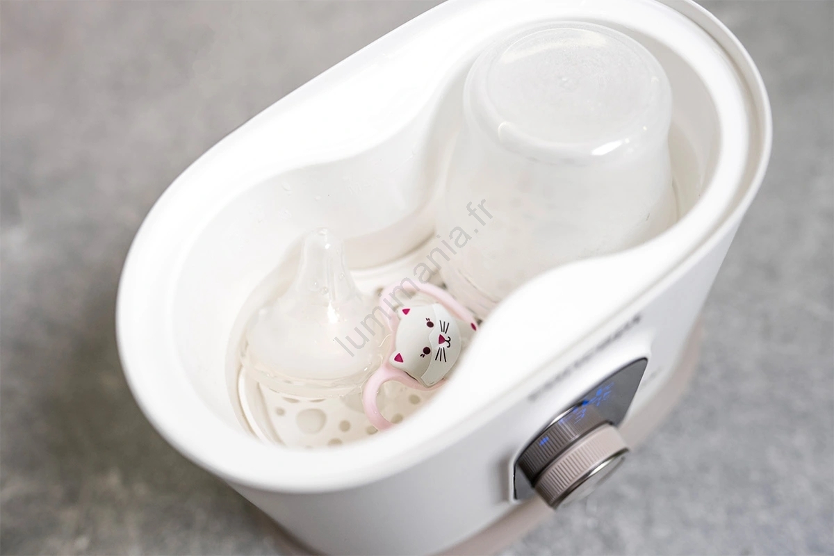 • Fini les longues ébullitions ou l'achat d'un stérilisateur pour biberons, tétines et autres accessoires : il suffit de choisir le programme de stérilisation et l'appareil s'occupe de tout.