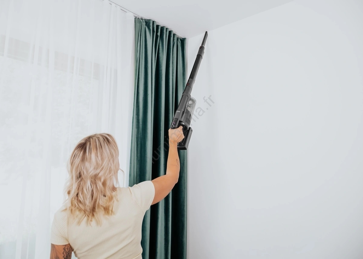 • Grâce à la batterie Li‑Ion amovible de 2200 mAh, il peut fonctionner jusqu'à 50 minutes sur une seule charge en mode MIN, ce qui constitue une autonomie suffisante pour le nettoyage courant des sols durs.
