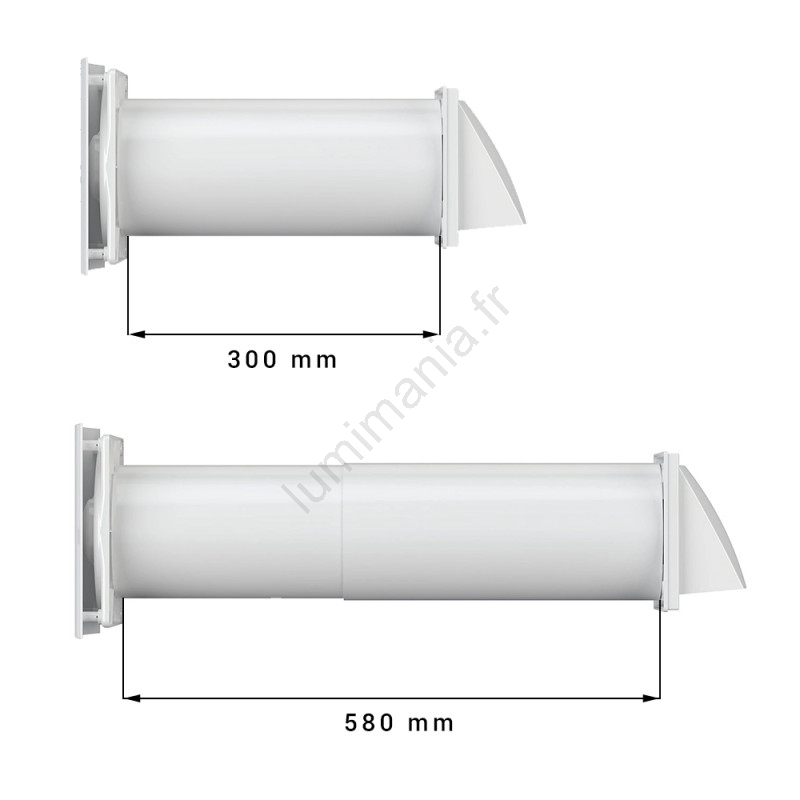 • Le conduit télescopique, avec une plage de 300 à 580 mm, permet un ajustement simple aux différentes épaisseurs de murs.