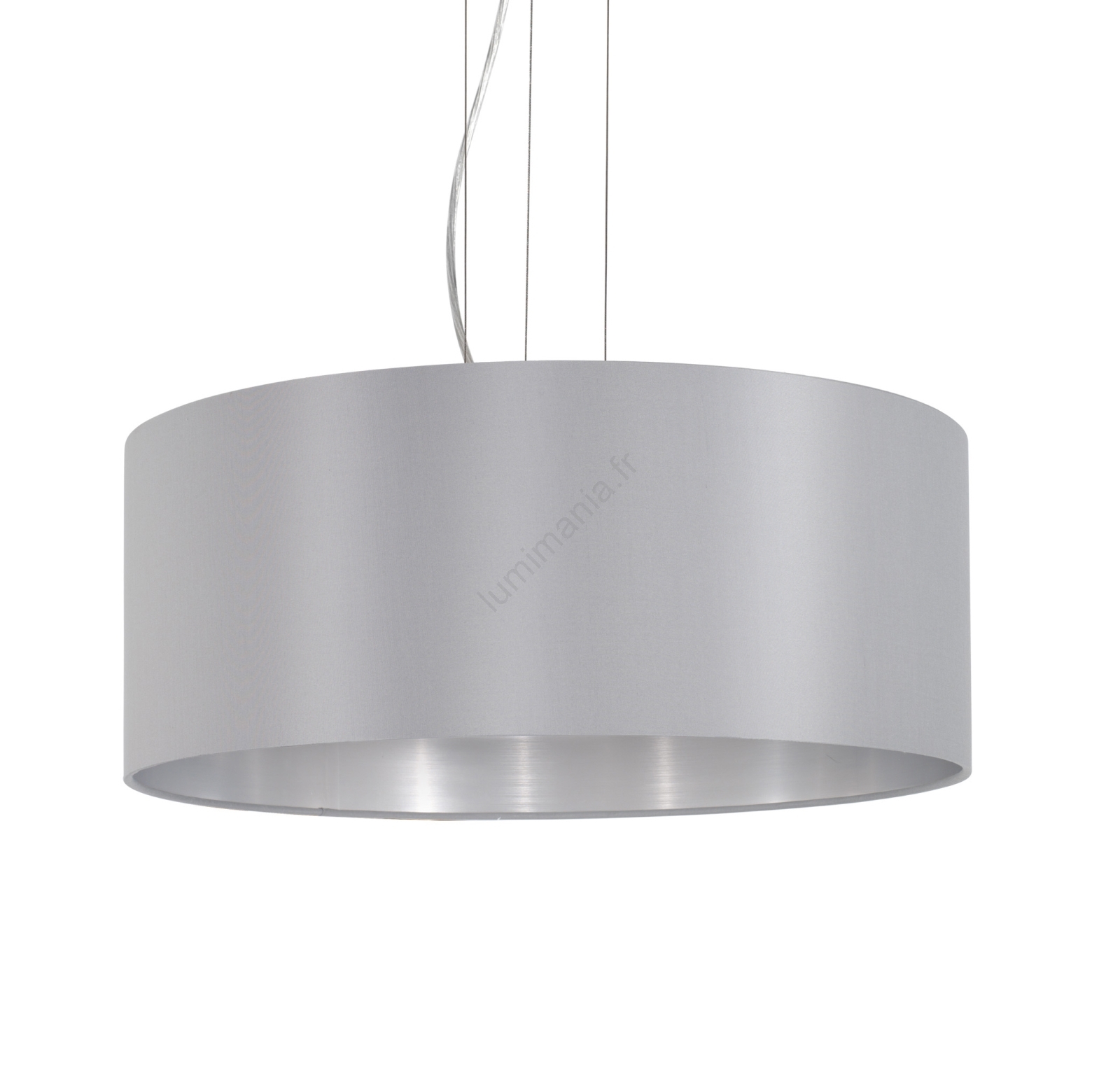 • L'apparence du luminaire est soulignée par un abat-jour en textile de couleur extérieure grise et intérieure argentée, complété par un suspensoir en métal.