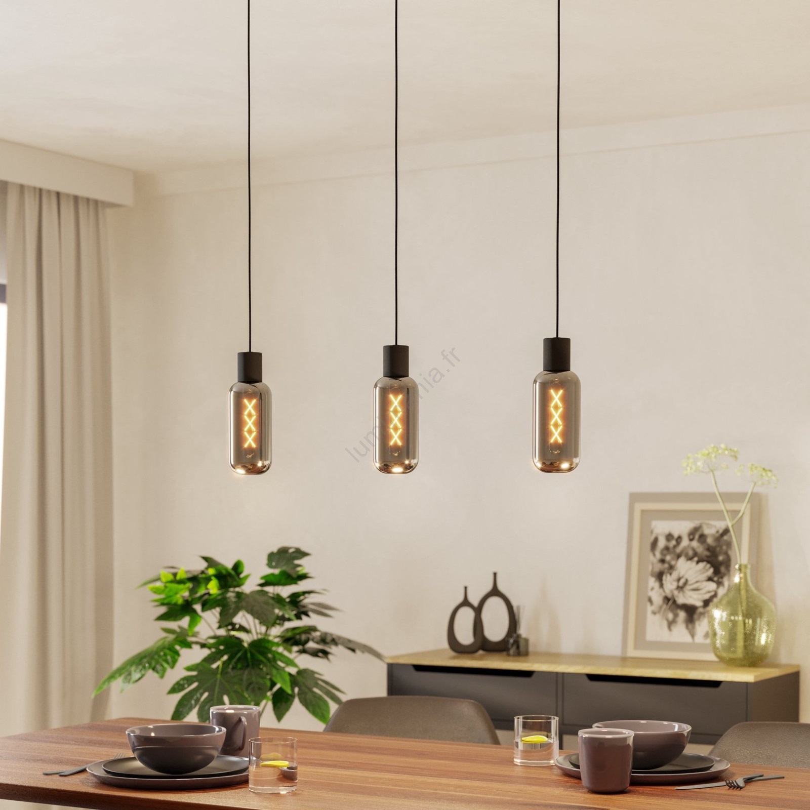 Eglo - Suspension sur câble 3xE27/4W/230V noir/fumé caractérise un design agréable et fonctionnel.  Une ampoule à culot E27 convient pour ce luminaire. Ici, vous pouvez acheter d'autres ampoules à des prix avantageux. Vous aurez un ajout intéressant dans votre intérieur.
