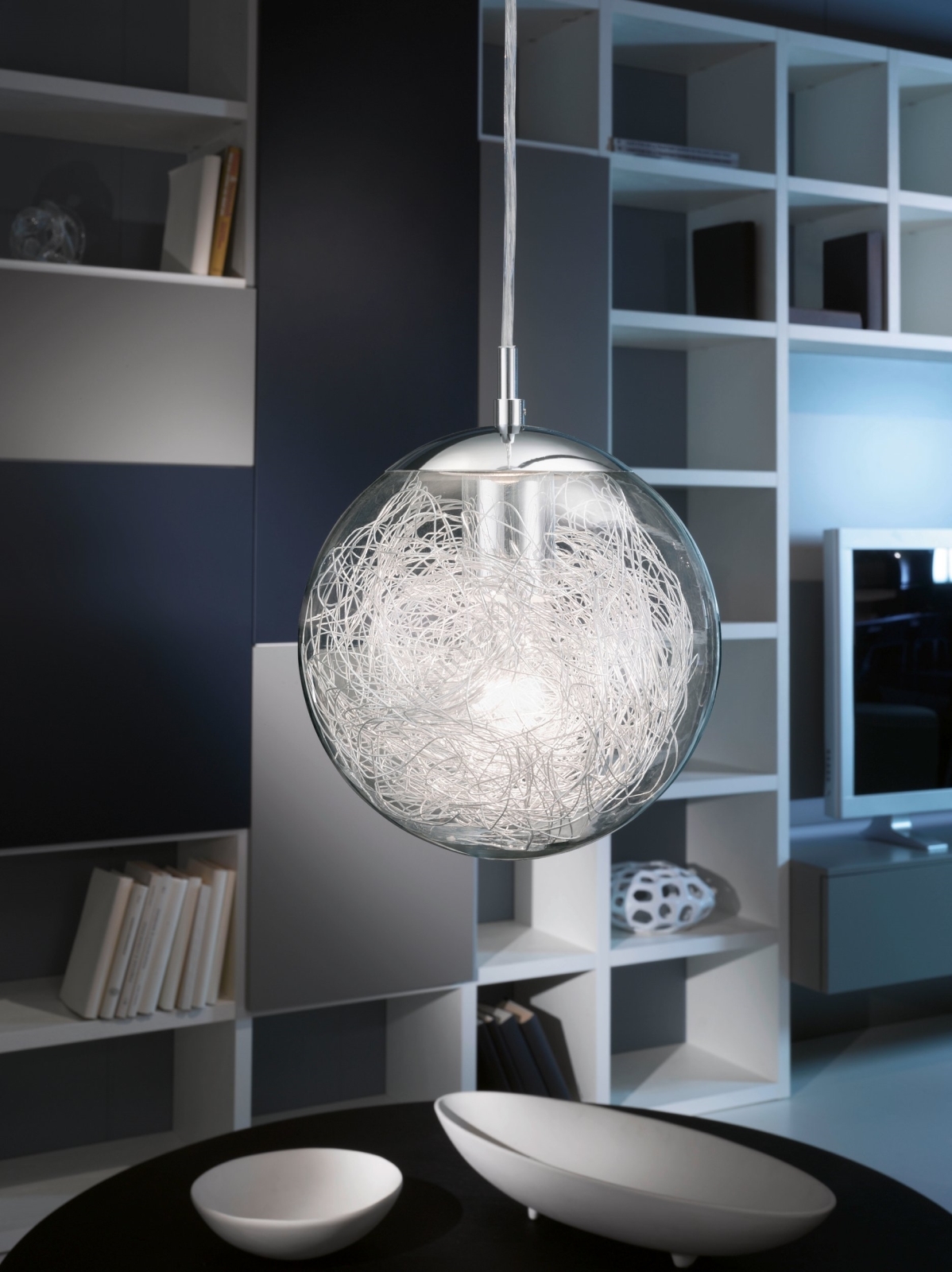 • Cette suspension au design élégant est fabriquée en métal avec une finition en chrome brillant et en verre.