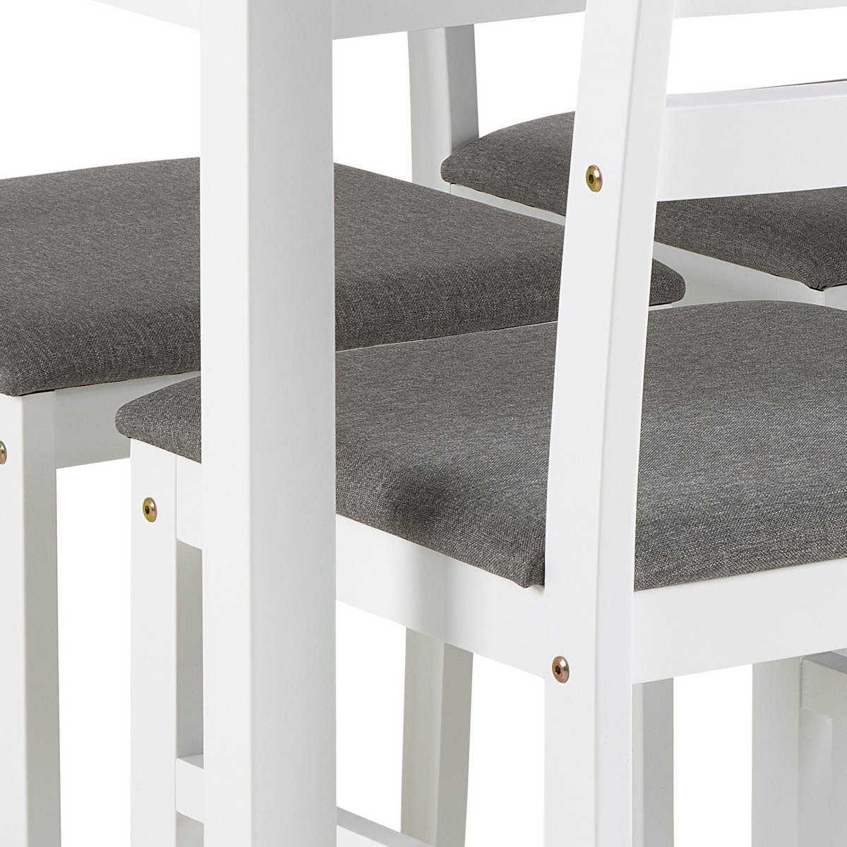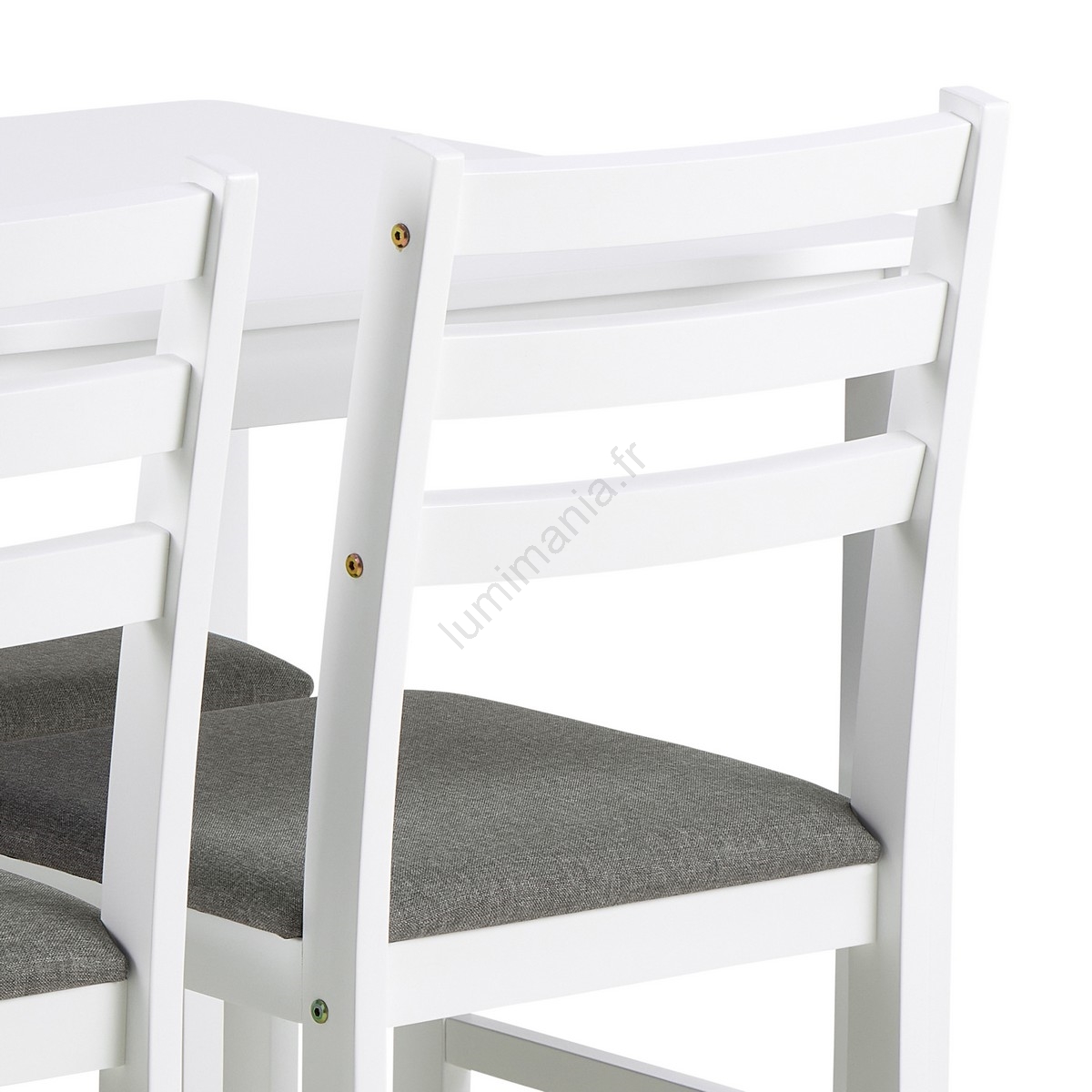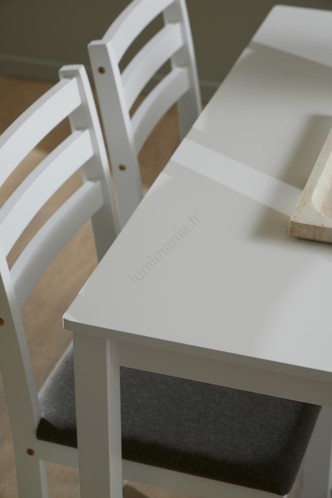 • Il se compose d'une table rectangulaire et de 4 chaises assorties à assise rembourrée gris clair, le tout en bois massif finition blanche.
