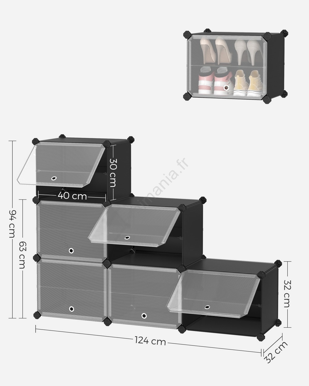 • Transformez-le en modules indépendants, ou divisez-le même en 2 petites étagères pour organiser chaussures, vêtements ou articles de toilette, dans la salle de bain ou tout autre espace souhaité.