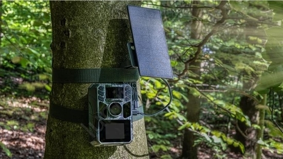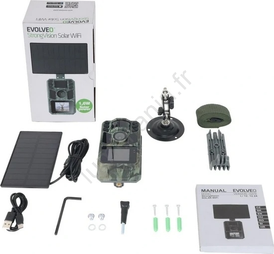 • Contenu du pack : caméra de chasse, panneau solaire, sangle de fixation, support fileté, câble USB-C et manuel d'utilisation.