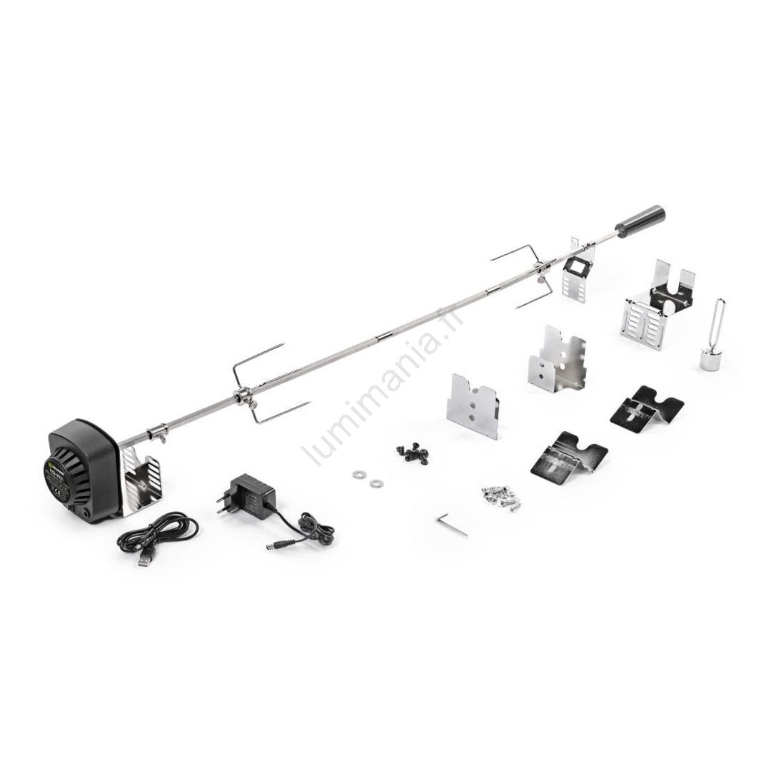 • Broche de rôtisserie ingénieuse en acier inoxydable, dotée d'un moteur électrique, garantit une rotation uniforme de la viande pour une cuisson parfaite.