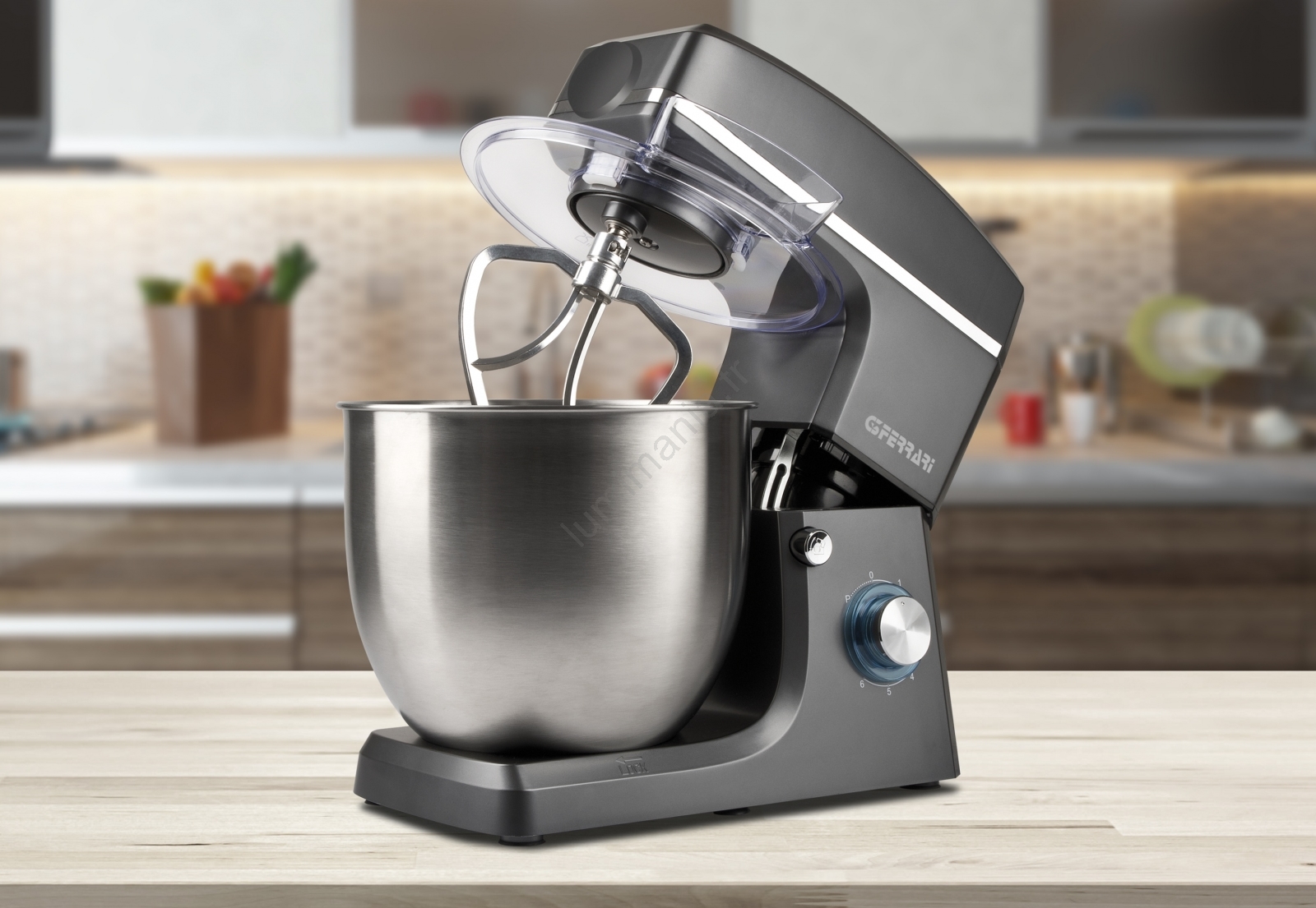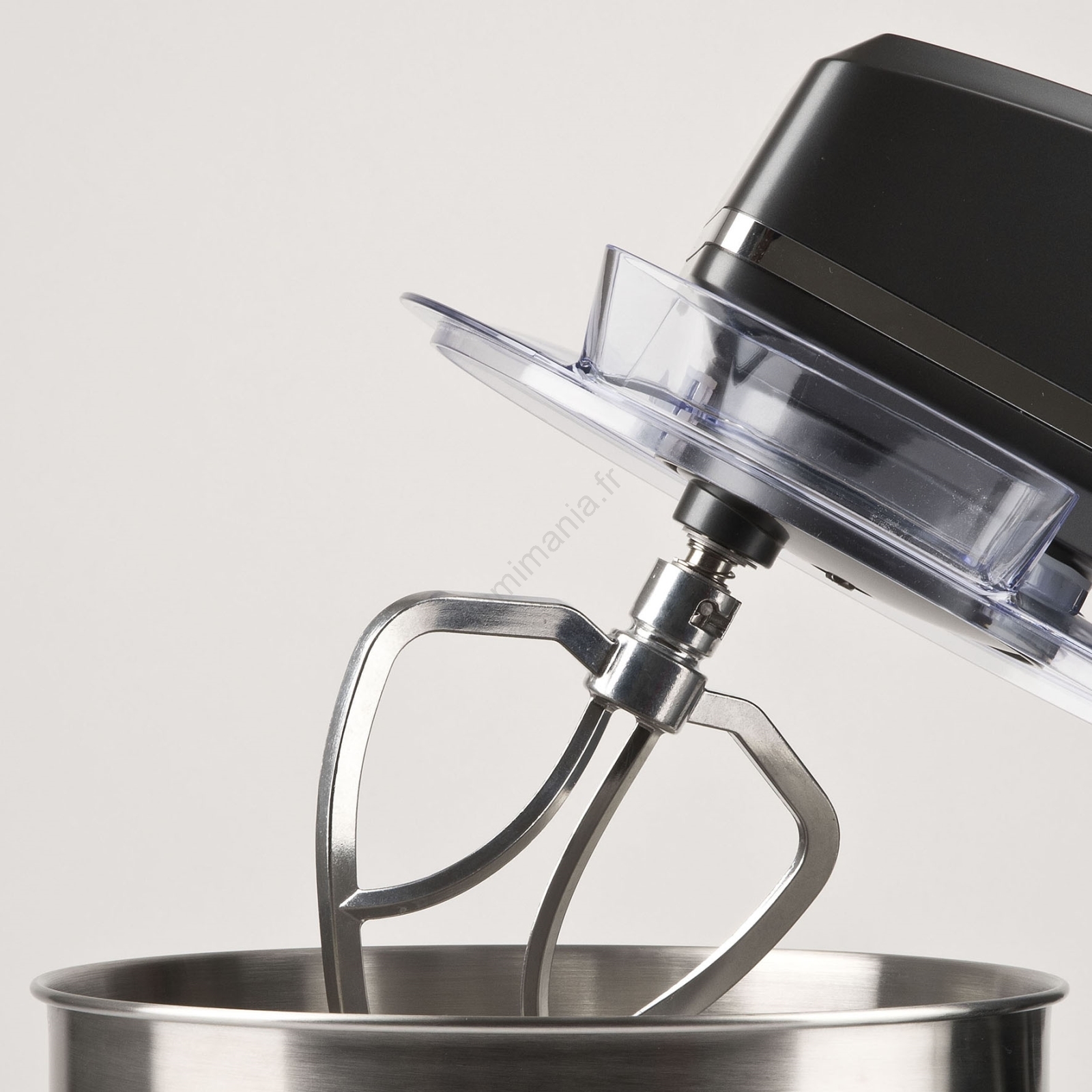 • Ensemble d'accessoires complet : crochet pétrisseur, pale mélangeuse, fouet et couvercle transparent pour le bol.