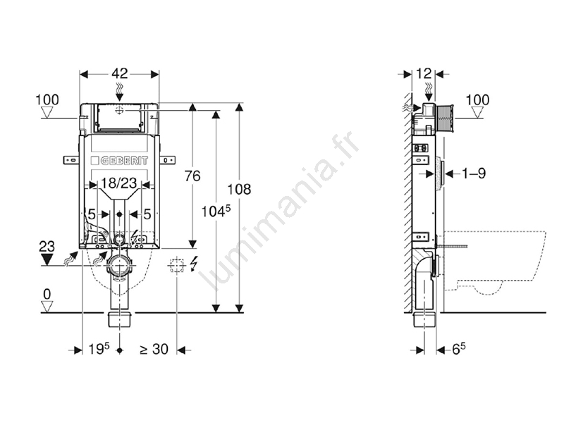 • Élément de montage pour WC suspendu geberit kombifix, 108 cm, avec réservoir de chasse encastré sigma 12 cm.