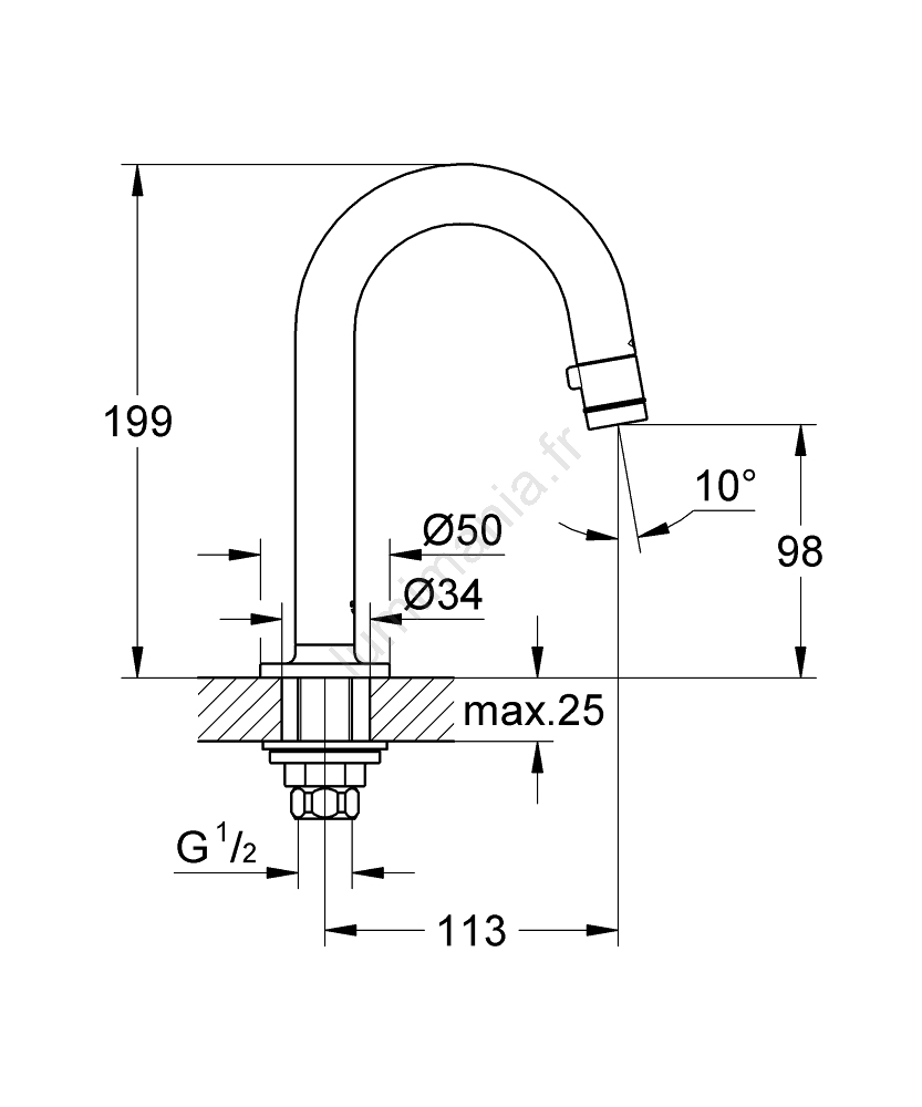 • Hauteur totale du robinet 199 mm et hauteur du bec 98 mm pour un usage confortable.