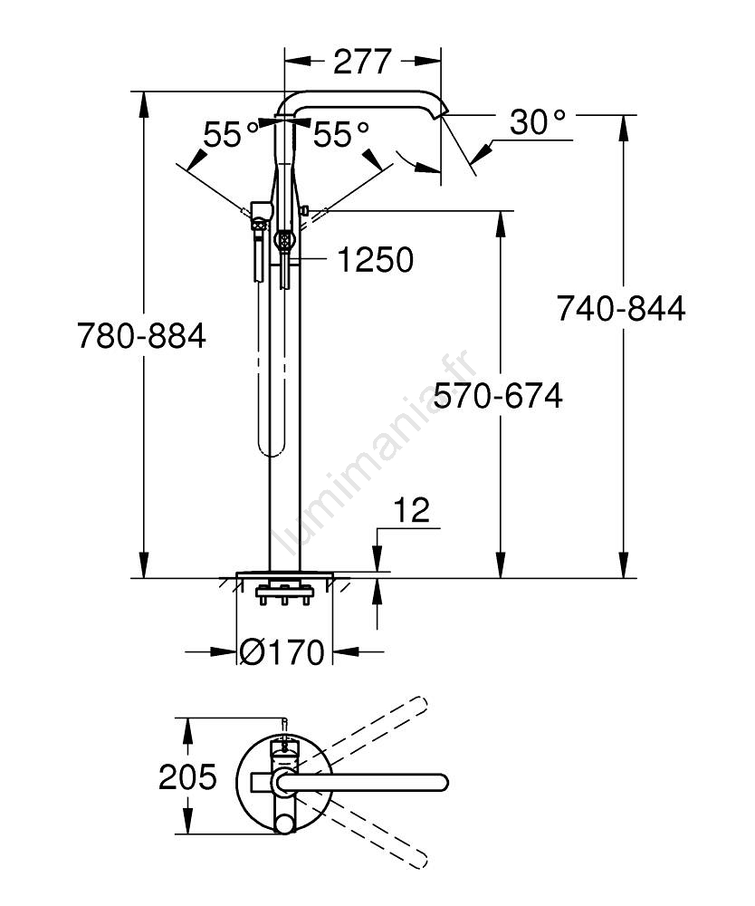 • Mitigeur monocommande pour baignoire monté au sol, idéal pour les baignoires autoportantes.