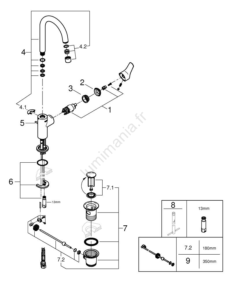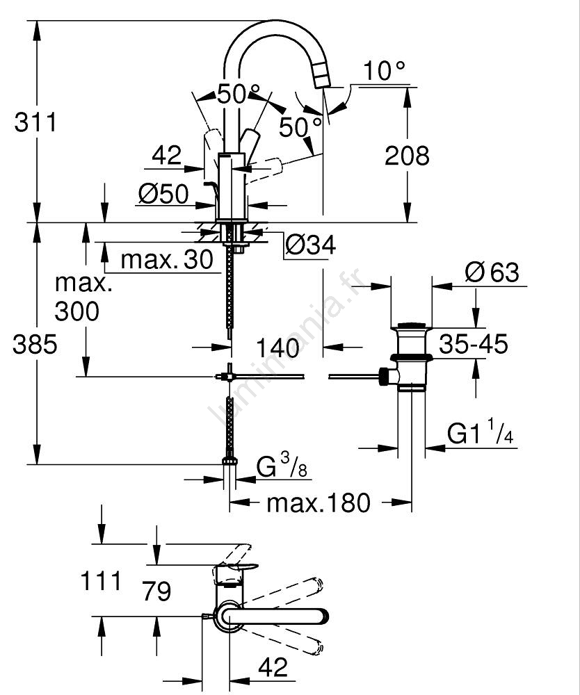 • Bec haut pivotant avec angle de rotation au choix : 0°, 150° ou 360° pour un confort maximal.
