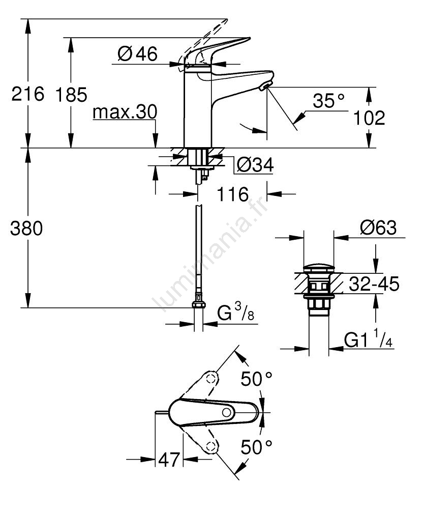 • Hauteur du mitigeur 185 mm et longueur du bec 116 mm offrant un espace confortable pour le lavage.
