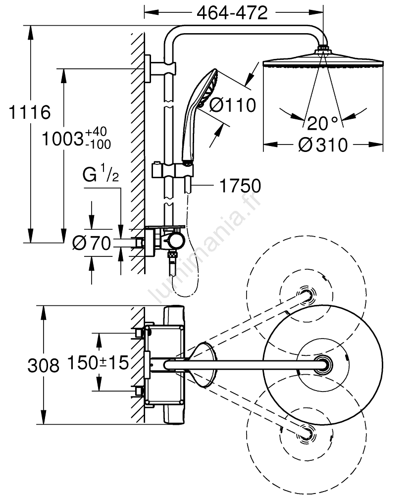 • Bras de douche pivotant horizontal de 450 mm pour un réglage flexible.