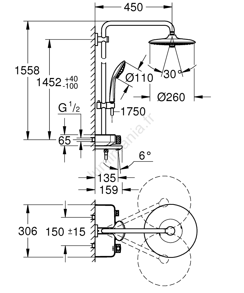 • Bras de douche orientable horizontal de 450 mm pour un réglage flexible.